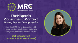 Members and friends of the MRC are invited to a virtual-only meeting of the Market Research Council on Thursday, October 9, at 12:30 PM Eastern (5:30 PM British Time). We will hear from new member Maria Parra, principal at Ingenium Research Boutique on diversity within Hispanic insights and how cultural affinity, rather than just demographics, can reveal deeper ways to connect with Hispanic audiences.